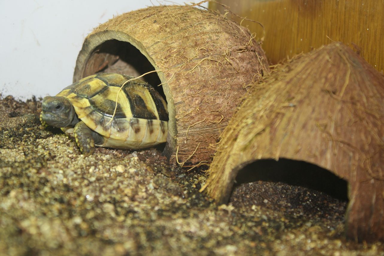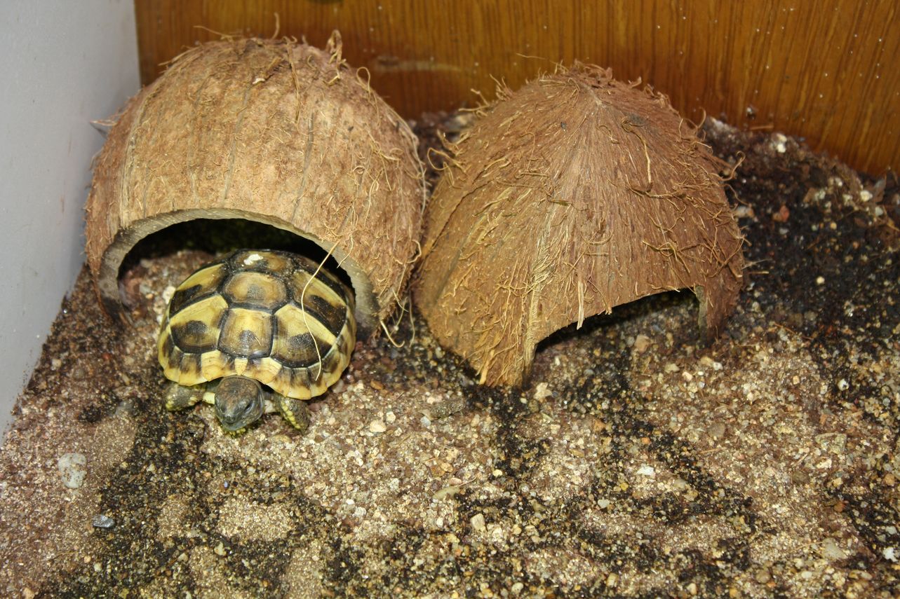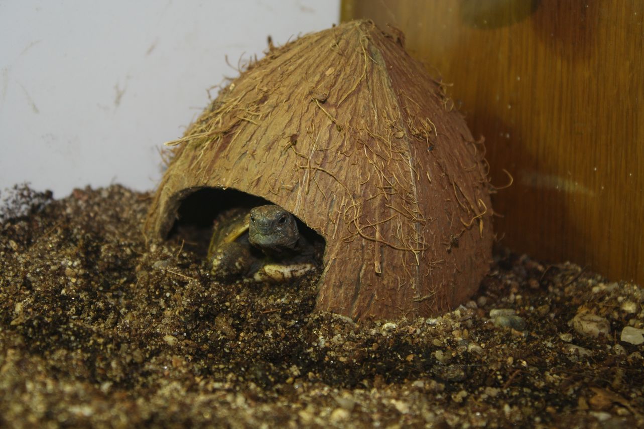 Domeček z kokosového ořechu. Želvička Lilinka se v něm zabydlila